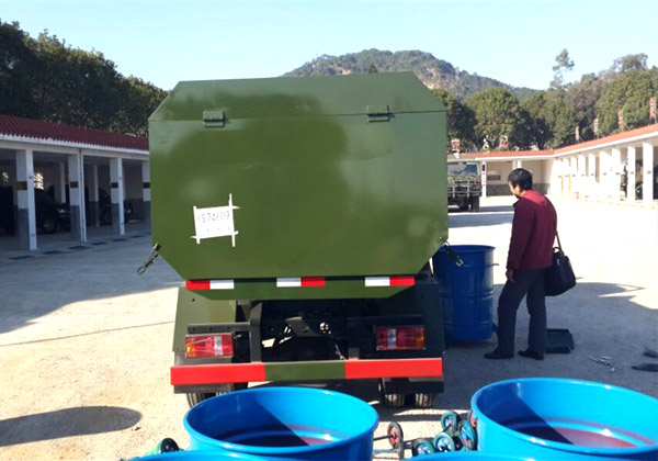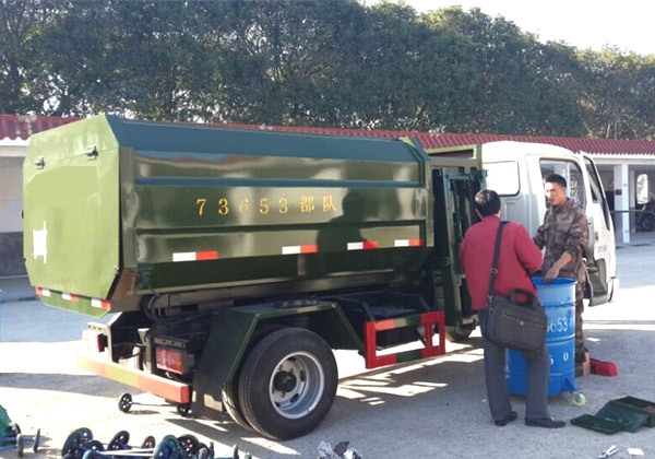 工作原理:自裝卸式垃圾車是由密封式垃圾廂、液壓系統、操作系統組成,能配幾十個垃圾桶,實現一車與多個垃圾桶聯合作業,廂體上的液壓升降裝置可將垃圾桶吊上、放下,上下升降,上下一次工作循環時間為50S,密封式廂體環保衛生,可避免二次污染。其自裝式的掛桶裝置可直接將路邊的垃圾桶掛在上面用提升機直接到在垃圾箱體里面省去了裝垃圾的麻煩。