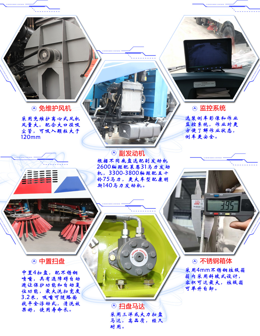 洗掃車、掃路車作為環衛設備之一,是一種集路面清掃、垃圾回收和運輸為一體的新型高效清掃設備。可廣泛應用于干線公路,市政以及機場道面、城市住宅區、公園等道路清掃。路面掃路車不但可以清掃垃圾,而且還可以對道路上的空氣介質進行除塵凈化,既保證了道路的美觀,維護了環境的衛生,維持了路面的良好工作狀況,有減少和預防了交通事故的發生以及進一步延長了路面的使用壽命。在國內利用路面掃路車進行路面養護已經成為一種潮流。